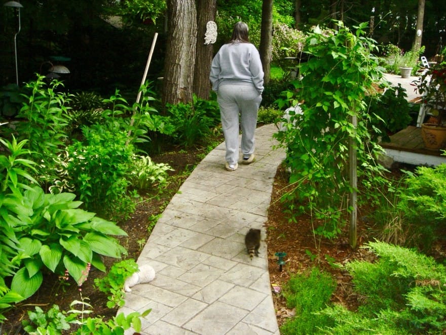 In some ways, Brown Eyes was the perfect pet. He was easy to care for, liked to be held, and got along great with the dogs. We could even take him out in the yard for little walks. I learned at the time that baby raccoons are like ducklings – they follow Mommy in a single-file line. Jane would walk around the property with her morning coffee, trailed in line by our two dogs with the baby raccoon bringing up the rear. It was adorable – a little parade going around the gardens. If Brown Eyes wandered off into tall plants and couldn’t see Jane, he would cry. Jane would make a little clucking noise, and he would come running.