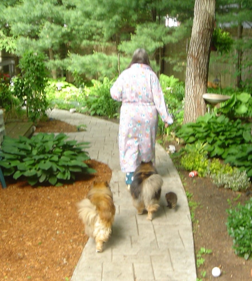 Left: Brown Eyes followed Jane everywhere. Right: Jane on her morning garden walk followed by (L-R) Angel, Lewis, and Brown Eyes.