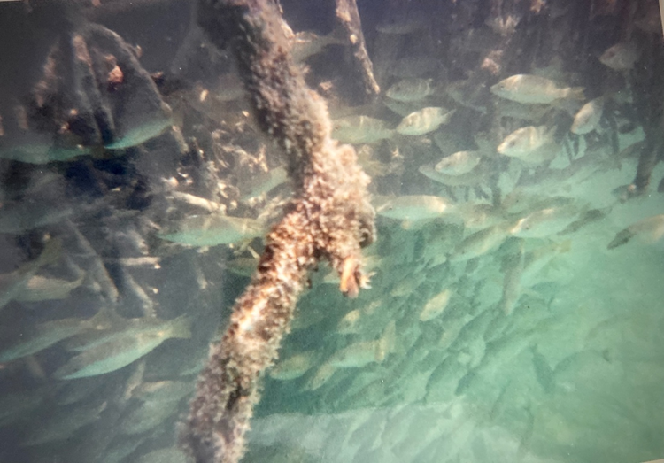 “This is where it all starts,” he said. “The mangrove swamp.” Bent over with our masks in the water, we could see millions of tiny fish (called fry). Fry of many fish species start their lives here. The mangrove roots were very dense, offering the fish protection from larger predators and preventing us from swimming among them. We only spent 15 minutes or so there, but it was eye-opening.