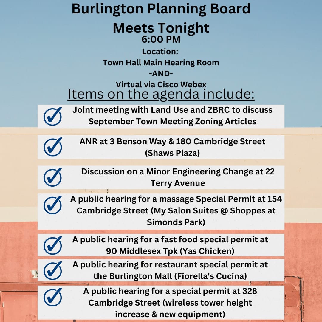 - 6:00 PM - Planning Board will meet jointly (and a half-hour earlier than usual) with the Land Use Committee and the Zoning Bylaw Review Committee to discuss zoning articles that will be presented at this September’s Town Meeting. They also have a number of projects to discuss (see below). (Town Hall and Virtual)