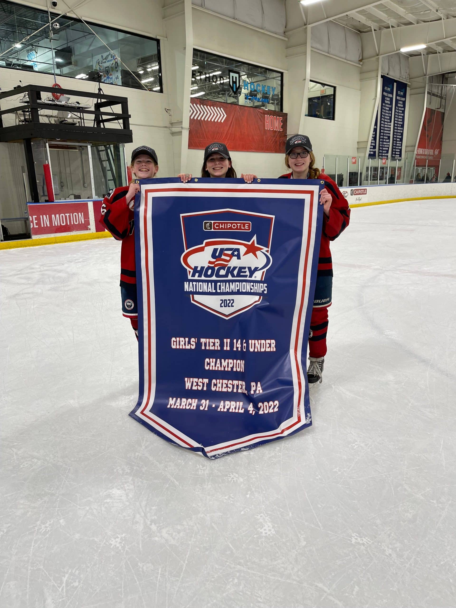 Kate Glantz, Janie Martin, and Caitlyn “CJ” Tremblay reached the pinnacle of sports achievement in April when their team, the North Shore Vipers, won the U14 Tier II National Hockey Championship in West Chester, PA, on April 4.
