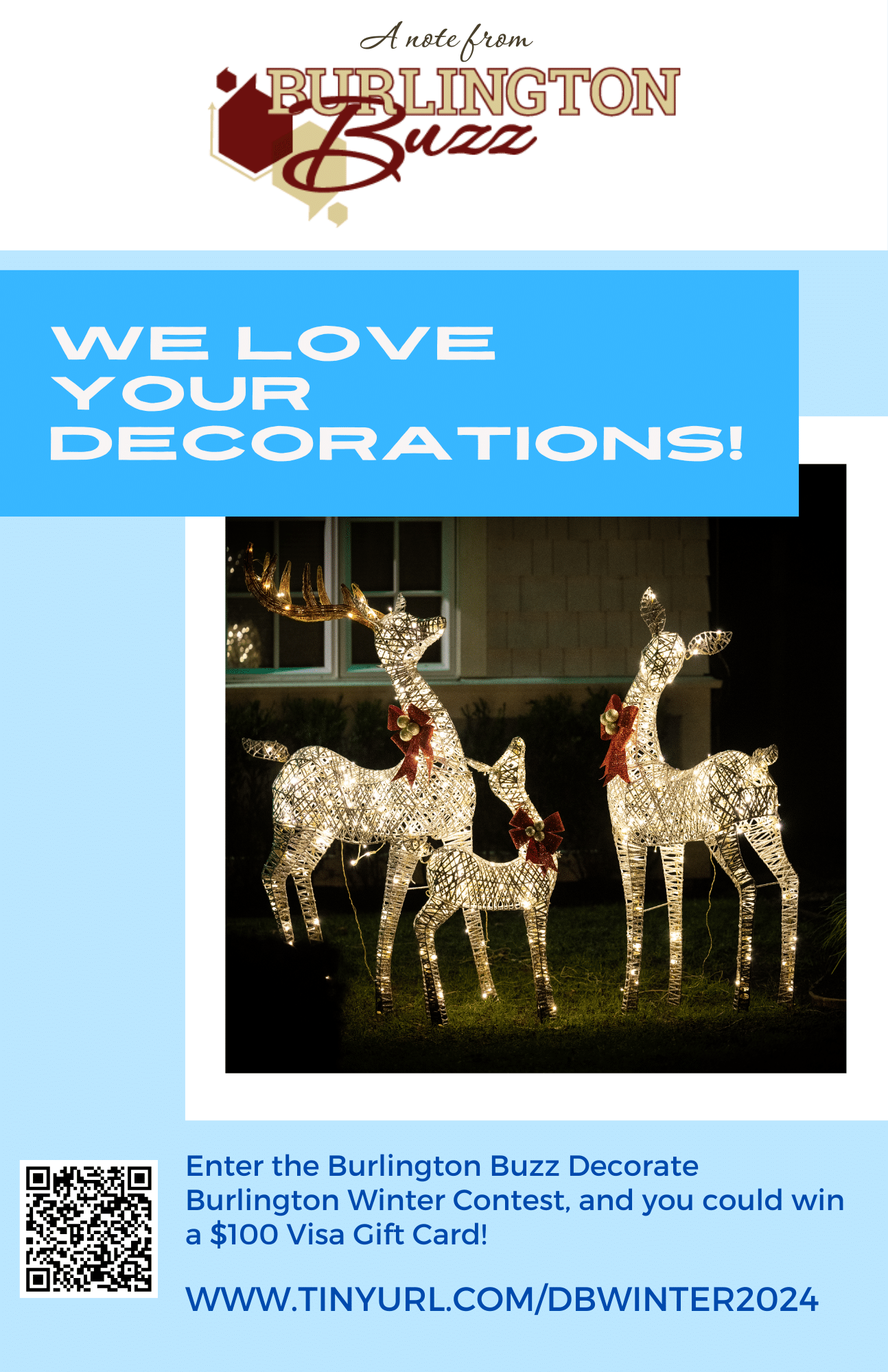 It's no secret that Burlington is filled with holiday spirit. A lighted winter scene here, Santa's workshop there...hundreds of homes decorate for the winter, and we want to award one lucky home with a $100 prize. Enter your home's outdoor decorations by submitting a photo to the Decorate Burlington Winter Contest. Homes that opt in will also be included on the Winter 2024 Decorations Map, which will be published along with the voting sheet - so you can take a driving tour around each home before you vote!
